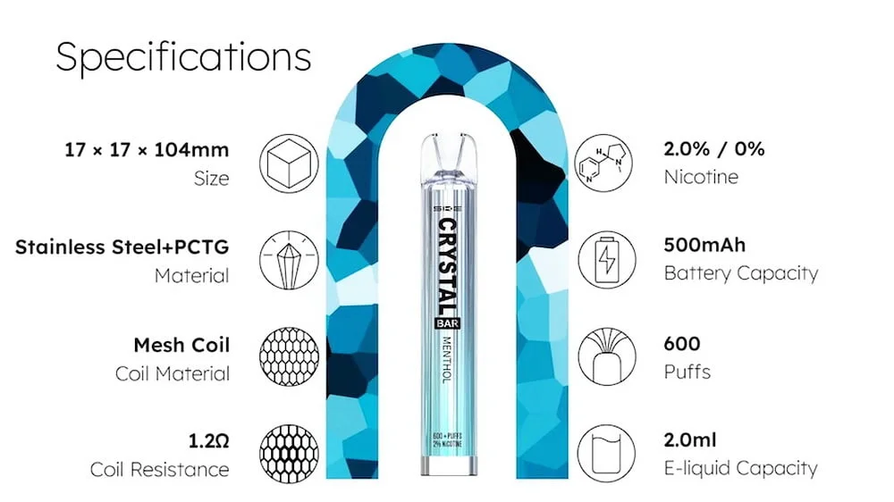Each Crystal Bar by SKE contains a disposable 500mAh battery, these vapes will work for up to 600 puffs. Once the battery has depleted, simply dispose of (check your local authorities information for details on how to recycle).